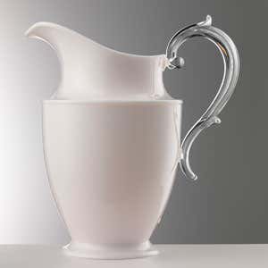 Ispirata alla Firenze rinascimentale la brocca Federica (1,5 litri) in acrilico declinata in sorprendenti tinte che spaziano dal trasparente, al fumè, al rosso, al verde, al viola fino ad arrivare al bianco smalto (nella foto a destra).