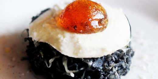 La parola 'Finto” nella moderna cucina, sta prendendo il sopravvento, spesso è abusata talvolta appropriata o comunque molto utilizzata come in questi 'finti spaghetti al nero di seppia, cuore di capasanta, e finto uovo di bufala e gelatina di moscato” (nella foto sotto). Un gioco, non per ingannare il commensale, ma confondere i sensi, e la memoria storica dei sapori che ognuno di noi possiede. è un rapporto tra vista e palato, per capire quanto influiscano le forme e i colori che riportano la nostra immaginazione a un tale ingrediente, per poi scoprirne in bocca un altro gusto, totalmente differente. Un allenamento, una danza dei sensi.