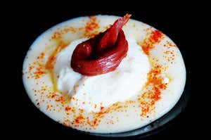 uovo, quindi il finto sembra vero e il vero non sembra tale. Questa è la sfida della cucina dei giorni d'oggi, fare e disfare, ingannare e stupire. Qui di seguito un 'uovo in camicia su purè di porro con polvere di tuorlo essiccato” (nella foto a destra).