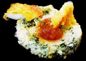 'Uovo di zucca e rosmarino con halibut impanato al profumo di zucca" (nella foto sotto a sinistra): si tratta di un uovo diviso e scomposto con due metodi differenti di cottura per poi assemblarlo nuovamente abbinandolo naturalmente a prodotti stagionali.