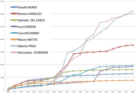 vedere grafico qui sotto) troviamo saldamente in testa sin dal primo giorno del sondaggio il fondatore del Cim (Chef italiani nel mondo) Marco Medaglia, che lavora come ristoratore ad Hong Kong, costantemente ed affettuosamente appoggiato dai suoi sostenitori del web sparsi in tutto il mondo. Ottimo piazzamento anche per Rosanna Marziale. Dopo essere arrivata quinta lo scorso anno, nel sondaggio in corso sta guadagnando voti a un ritmo via via crescente, raggiungendo così, a partire dal 10 dicembre, la seconda posizione. C'è evidentemente una forte carica da parte dei suoi sostenitori, che stanno cercando di tenere testa a quelli dell'attuale primo in classifica Marco Medaglia.