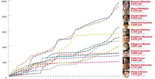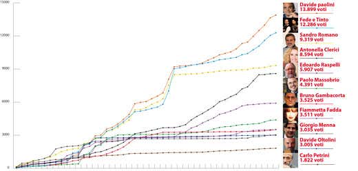 Andamento del voto dei candidati che per almeno un giorno sono stati tra i primi 5 in graduatoria
