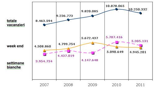 Confrontando i dati delle settimane bianche e dei weekend sulla neve nel periodo considerato, si evidenzia come nell'ultimo biennio (2010-2011) i weekend sulla neve abbiano coinvolto un minor numero di vacanzieri rispetto alle settimane bianche mentre tra il 2007 e il 2009 il fenomeno risultava invertito, con un maggior numero di vacanzieri che hanno usufruito di un weekend sulla neve.