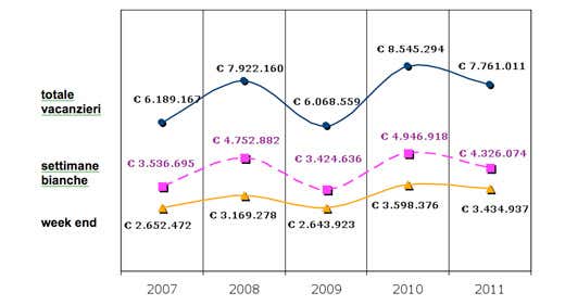 Per l'esattezza il turismo bianco è complessivamente aumentato passando da 8 milioni 464mila individui nel 2007 a circa 10 milioni e 250mila nel 2011 per un incremento del 21%.