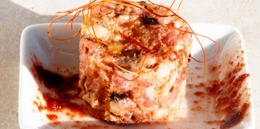 Preparazione: far rinvenire le prugne in una ciotola con il brandy fino a coprirle, insieme a un goccio di acqua bollente, per almeno mezz'ora. Scaldare una padella antiaderente con un filo d'olio, l'aglio e il lardo pestato con il rosmarino. Unire 250 g di salsiccia 'sgranata”, un mazzetto di erbe aromatiche e sfumare con il brandy utilizzato per le prugne. Salare, pepare e una volta ben rosolato il tutto togliere le erbe e l'aglio. Poi amalgamare, appena tiepida, la carne cotta con la rimanente cruda, controllare di sapore e aggiungere, sempre impastando bene, le prugne sgocciolate. Servire la Tartare coppata sopra su una pennellata di mostarda di prugne come base.