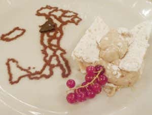 Dulcis in fundo un dessert leggero e dal sapore avvolgente: Papillon di millefoglie artigianale farcito con crema chantilly aromatizzata con granella di amaretti, servita con una decorazione in cacao a riprodurre lo Stivale e un cioccolatino fondente in corrispondenza della regione Toscana. Abbinato alla delizia dolce un Franciacorta Brut di Monte Rossa di Bornato di Cazzago S. Martino (Bs).