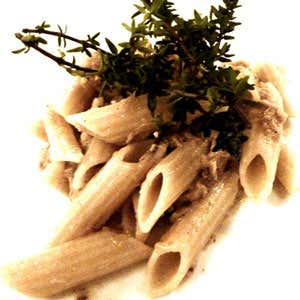Lo stesso vino si è sposato alla portata seguente, pennette di Farro Latini (che ha anche realizzato un originale centrotavola di pasta) con grosso di coniglio al profumo di timo, dal sapore delicato.
