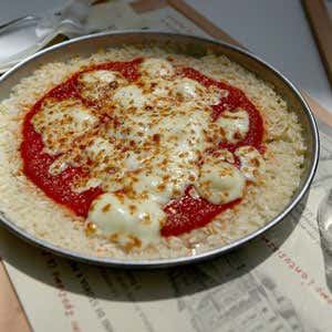 Ingredienti per 1 Prisotto: 100 g di Riso Gallo Carnaroli, 1 noce di burro, 100 g di passata di pomodoro, 2 mozzarelle, Parmigiano grattugiato, origano, olio extravergine d'oliva