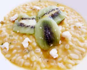 Aspetto che l'orzotto si intiepidisca un attimo, lo unisco al pane e compongo il piatto stendendo alla base i pezzettini di kiwi, quindi la pappa di orzo e sopra delle fettine del frutto stesso; un'altra spolverata di coriandolo, un altro filo d'olio e siamo pronti per assaporare un piatto fresco, completo, saporito e soddisfacente, sicuramente meglio dell'orzo in brodo (nella foto a sinistra).
