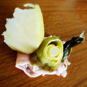 Estraete la polpa della mela e conditela in questo caso con un po' di sale all'aglio orsino e olio extravergine di oliva, lavoratela bene con la vostra forchetta di plastica (attenzione a non rompere le punte per non strozzarvi o non poter più mangiare dopo), fino a formare un composto molto omogeneo e cremoso. Lasciate invece insaporire i porri con un goccio di aceto balsamico e formate il piatto stendendo una fetta di prosciutto come base e alternando le sfoglie di porro alla crema di mela cotta (spalmata tra sfoglia e sfoglia di porro per ricomporlo) formando un rollè. La fetta di mela fresca dona leggerezza al piatto (nella foto a sinistra).