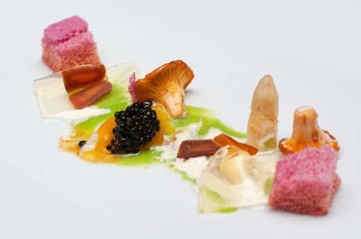 Composizione del piatto: stendere la crema di piselli, alternare con la burrata, a piacere aggiungere i ravioli di pomodoro, il panne alla barbabietola, finferli asparagi 2 scaglie di bottarga e infine l'uovo e un cucchiaio di caviale.