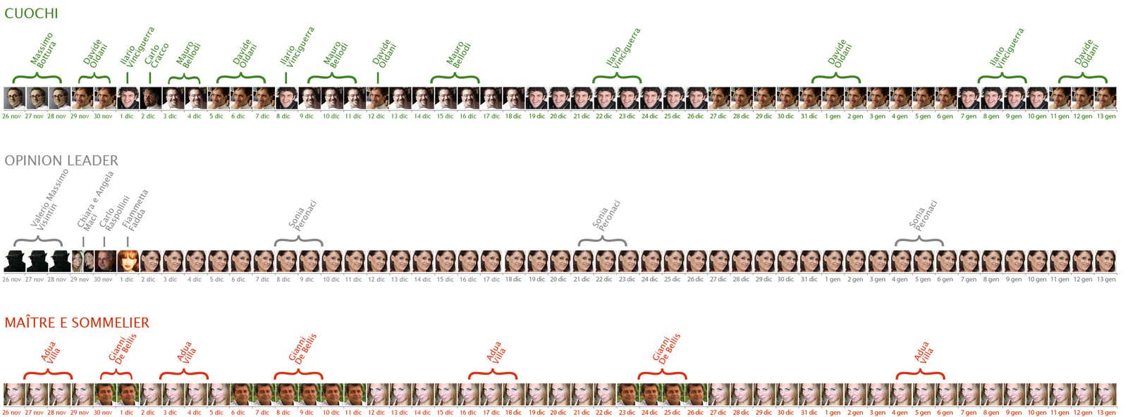 MAÎTRE e SOMMELIER – Adua Villa, la popolare sommelier spesso ospite in televisione, dopo avere strappato la guida della categoria al sommelier romano Gianni De Bellis, ha praticamente tenuto la testa della sezione vincendo con 8.259 voti sui 46.591 votanti. Sia Villa che De Bellis erano alla prima presenza in gara. Nella precedente edizione, Alessandro Scorsone aveva raggiunto il podio con 7.871 preferenze su 41.457 votanti. Dopo Alessandro De Bellis al terzo posto c’è un’altra donna, Livia Iaccarino, che con 4.918 ha migliorato la quinta posizione del 2011 (3.360 preferenze)