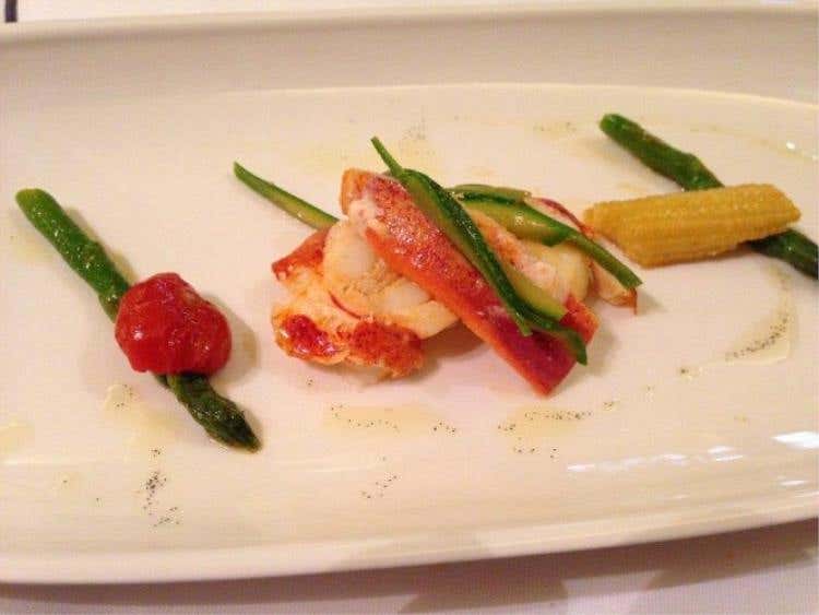 Per i primi lo chef propone, oltre alle pietanze disponibili a pranzo, i ravioli ripieni di burrata con salsa all’amatriciana (vedi foto), pasta e patate alla partenopea, spaghetti alle vongole con bottarga e polvere di capperi e tagliatelle al ragù di anatra con mandorle tostate. Tra i piatti di pesce, la ricciola bruschettata con riso venere e pomodorini roesti, la zuppetta di pesce del Mediterraneo e il fritto misto di pesce con maionese e birra al coriandolo. Per i piatti di carne filetto di manzo con patate, asparagi e salsa al vino rosso di Valpolicella e il filetto di vitello agli agrumi di Sicilia con spinaci saltati e tortino di patate e lo speciale duetto d’anatra che comprende coscia d’anatra confit su tortino di patate e il petto d’anatra arrostito ai frutti di bosco.