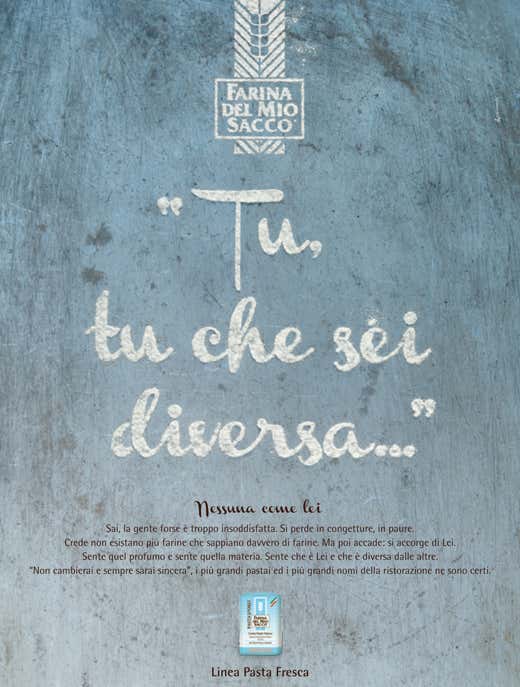 È stata presentata la nuova campagna istituzionale dedicata ai marchi Molino Pasini e Farina del Mio Sacco. Nell’ormai celebre “Nessuna come Lei” del biennio 2011-2012 le parole erano lasciate scritte nella farina da chef, maestri pasticceri, pizzaioli e della panificazione; qui invece è la stessa farina a diventare parola scritta. “Tu, tu che sei diversa” è una dedica perdutamente innamorata. Una dedica di quella stessa farina, fatta delle parole di una delle voci italiane più emozionanti di sempre e donate ora ad una delle più pure eccellenze Made in Italy. La creatività è ancora una volta opera dell’agenzia copiaincolla pubblicità.