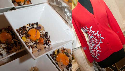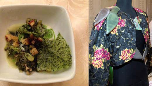 Luca Parenti, docente dei corsi di moda allo IED di Firenze - a questo incontro creativo tra cucina e moda: due importanti aspetti dell'italianità che esportano nel mondo il nostro estro e la nostra creatività. Come i grandi chef presenti allo show cooking anche noi con gli studenti abbiamo reinterpretato, data una nuova "mise en place" a capi di abbigliamento classici e vintage. Ci siamo poi divertiti a presentare accanto agli abiti, pensati per una cena nei ristoranti dei rispettivi chef, una piccola cassetta di frutta contenente gli ingredienti del nostro processo creativo... aghi, filo, tessuti e accessori vari».
