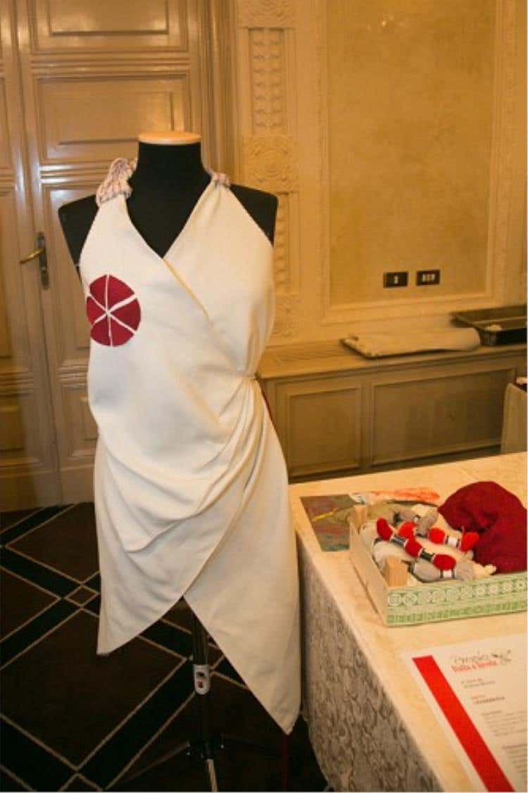 Preparazione: Rifinire le estremità della preparazione con una bella bordura abbastanza spessa che esalti la scollatura e faccia ben piombare la gonna. Decorare la bordura inferiore con leggeri pois bianchi. Avvolgere il tutto in scialle di lino realizzandolo, con tanta pazienza, all’uncinetto.