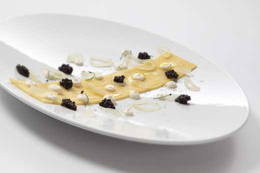Un primo originale che può essere proposto anche come antipasto, per una serata con il caviale protagonista. Semplice e di grande effetto gustativo, merita una particolare cura creativa nella disposizione su un ampio piatto bianco.