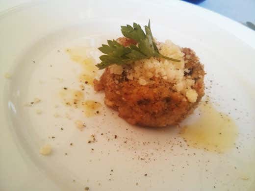 Il benvenuto dalla cucina si sostanzia e si palesa con un saporito timballino di broccoli e salsiccia su cui cade dapprima lardo sfrigolante di maiale nero casertano ed a seguire una spolverata abbondante di Parmigiano-Reggiano Dop di 28 mesi. Al calice un gradevolissimo Prosecco Doc Treviso Extra Dry Miòl di Bortolomiol. Si prosegue con funghi crudi di Roccamonfina, il vulcano spento dell’Alto Casertano, lamellati con Radicchio Trevigiano brasato al Casavecchia: spettacolo alla vista e delizia al palato in gioco non facile di texture e di armonico avvicendamento di sapori.
