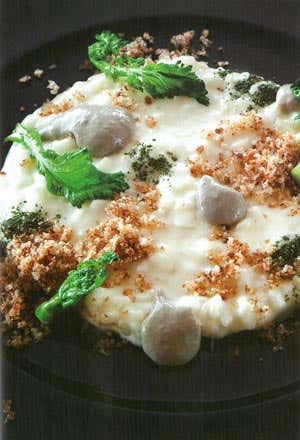 Finitura: adagiare il risotto su un piatto piano fino a ricoprire tutto il fondo, spolverare con le briciole di pane e guarnire con le cime di friarielli ripassate, la crema di alici e la polvere di friariello.