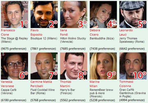 Leonardo Leuci del “Jerry Thomas Speakeasy” di Roma occupa la quinta posizione; Carmine Mattia Perciballi del “Fluid Cocktail Wine Bar” di Roma la settima; ottavo posto per Thomas Martini dell’“Harry's Bar” di Firenze; infine, Tommaso Colonna del “Gran Caffè Gambrinus” di Gravina in Puglia (Ba) ha guadagnato la decima posizione.