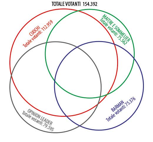 Nello schema qui sotto, gli insiemi rappresentano il totale dei votanti in ciascuna sezione (Cuochi, Opinion leader, Maitre e Sommelier, Barman), mentre le intersezioni tra i vari insiemi si riferiscono alle persone che hanno espresso almeno una preferenza in più di una sezione.
