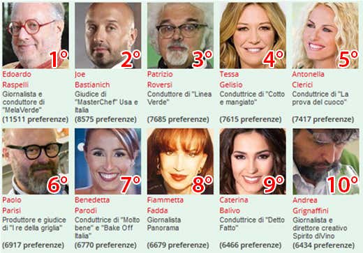 Opinion leader (79.595 votanti)Grandissimo successo per uno tra i più importanti critici enogastronomici italiani: re indiscusso degli opinionisti è infatti Edoardo Raspelli, giornalista e conduttore di “MelaVerde”, che si è classificato primo con 11.511 preferenze. Per Joe Bastianich (8.575 voti), giudice di “MasterChef Italia”, e Patrizio Roversi (7.685 voti), conduttore di “Linea Verde”, abbiamo una sorta di déjà vu perché, proprio come lo scorso anno, si sono classificati rispettivamente secondo e terzo. Grande, quindi, il sostegno del pubblico, ma anche quest’anno non sufficiente da assicurare loro la vittoria.