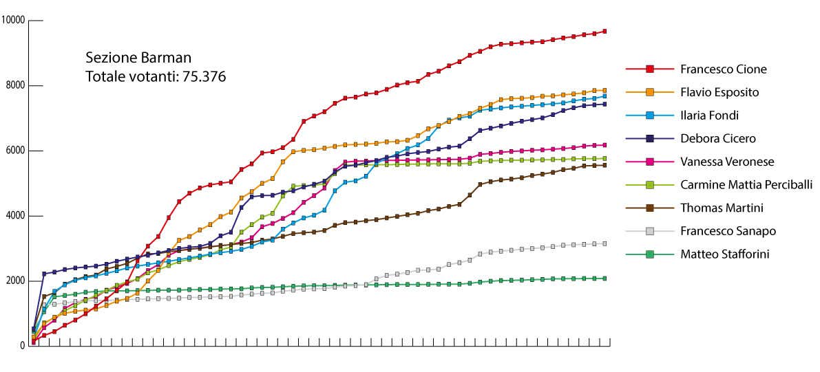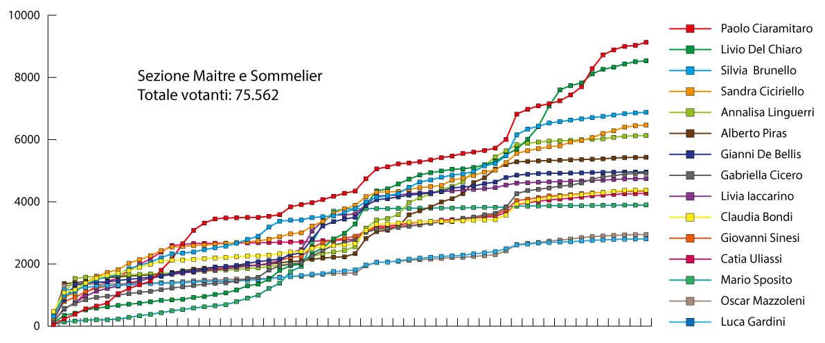Meno netto l’andamento delle prime 3 posizioni nella sezione Maitre e Sommelier, dove nelle prime 2 settimane del sondaggio sul podio si sono avvicendati vari candidati, da Claudia Bondi ad Annalisa Linguerri, da Silvia Brunello a Gianni De Bellis e così via. Nelle restanti 6 settimane ha poi preso le redini della classifica Paolo Ciaramitaro, che si è aggiudicato la vittoria con 9.131 preferenze. A 10 giorni dalla chiusura delle votazioni, Livio Del Chiaro è riuscito a conquistare la prima posizione, ma soltanto per 3 giorni. Clicca sull'immagine per ingrandirla.