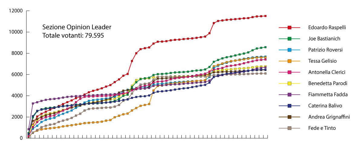 Dal grafico è evidente che, per quasi tutta la durata del sondaggio, i candidati che hanno dominato costantemente la graduatoria sono Luca Montersino e Antonino Cannavacciuolo. Il pasticcere e lo chef si sono avvicendati più volte al comando della classifica, distanziando di molto tutti gli altri candidati. Montersino alla fine è uscito vincitore con 19.462 preferenze, contro le 18.895 di Cannavacciuolo. Clicca sull'immagine per ingrandirla.
