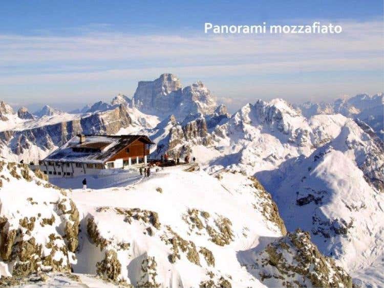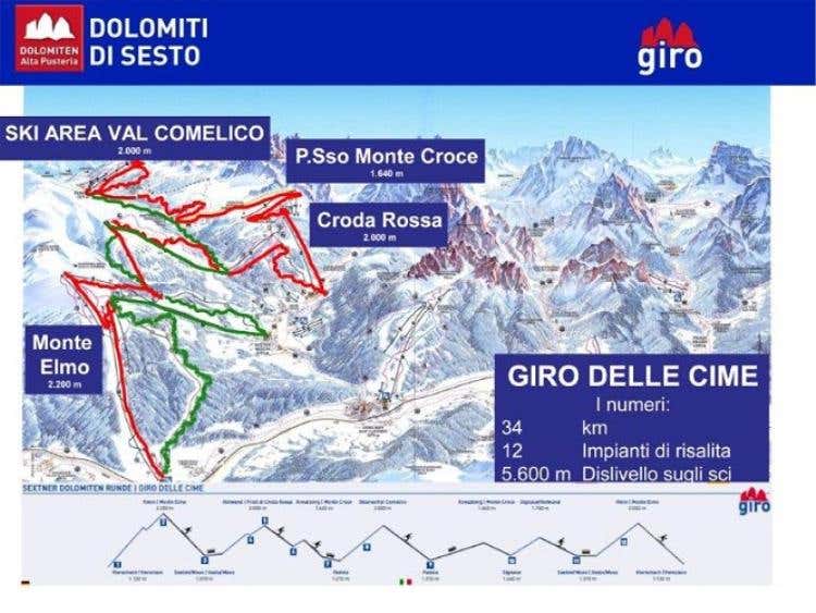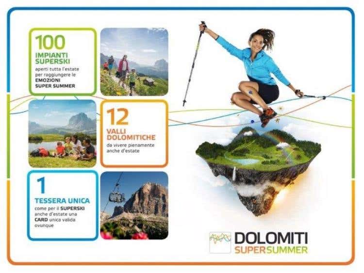 - Zone sciistiche (12): Cortina d’Ampezzo; Kronplatz-Plan de Corones; Alta Badia; Val Gardena/Alpe di Siusi; Val di Fassa/Carezza; Arabba/Marmolada; Sextner Dolomiten/Alta Pusteria; Val di Fiemme/Obereggen; San Martino di Castrozza/Passo Rolle; Valle Isarco; Trevalli; Civetta.