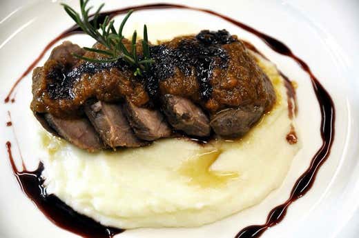 Preparazione: iniziare rosolando in una casseruola cipolla, carote, sedano tagliati a cubettini, aggiungere i pelati, il brodo di carne, le erbe aromatiche e sobbollire per qualche minuto. A parte rosolare le guance precedentemente sgrassate, salare, pepare e bagnare con il vino Groppello. Lasciare ridurre, quindi aggiungere al fondo preparato in precedenza. Lasciare raffreddare il tutto, quindi mettere sottovuoto in un sacchetto da cottura e mettere a bagnomaria a 80°C per 6-8 ore. Preparare la crema di patate bollendo in acqua salata le patate per circa mezz’ora, schiacciarle, aggiungere tutti gli ingredienti e sbattere energicamente aggiungendo il latte fino alla giusta consistenza. Preparare la riduzione mescolando il vino con lo sciroppo di glucosio disidratato e ridurre fino alla consistenza di uno sciroppo. Trascorso il tempo di cottura delle guance, separare la carne dal liquido, togliere le erbe aromatiche quindi passarlo e legarlo con la farina fino a renderlo cremoso. Comporre il piatto mettendo al centro la crema di patate formando un cerchio, posizionare la guancia tagliata a fette, coprire con un po’ di salsa e terminare con un giro di riduzione di vino Groppello e un ciuffo di rosmarino.