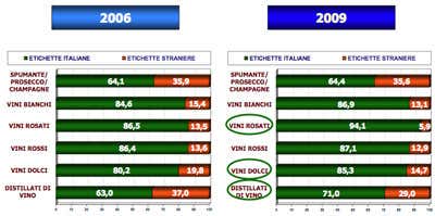 componente essenziale è rappresentata dagli champagne (slide 13), in ogni caso le etichette italiane sono preponderanti in tutte le tipologie di vino e si è ridotta, come dimostra il grafico qui a fianco, la presenza straniera tra i vini rosati, dolci e i distillati (slide 20). Praticamente assente dai ristoranti italiani è inoltre il 'cava” spagnolo (slide 14). Cresce invece, anche se pur sempre in una nicchia di mercato, la presenza dei vini neo-zelandesi e argentini, ormai ordinabili in circa un terzo dei locali italiani (slide 22). Tra i vini italiani si assiste poi ad un'importante valorizzazione dei vini locali (slide 23 e 24).