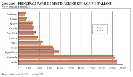 Nel 2007, il settore leader in Europa per numero di Dop e Igp (29 salumi tutelati) ha confermato la tendenza all'aumento delle esportazioni di salumi superando i valori percentuali dell'anno precedente. Nel periodo di riferimento sono stati spediti oltre confine prodotti per ben 105.900 tonnellate (+4,3%) per un corrispettivo di circa 820 milioni di euro (+6,6%). L'attivo commerciale ha evidenziato un importante miglioramento, passando da 623 a 679 milioni di euro (+8,4%).