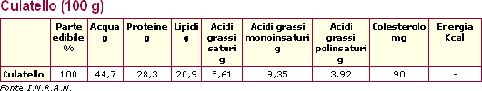 è considerato tra i salumi di maggior pregio della tradizione produttiva nazionale. Si ottiene dagli arti posteriori di suino freschi, sgrassati e privati della cotenna, isolando la massa muscolare che si trova intorno al femore. La parte anteriore del taglio è destinata alla preparazione del "fiocco", che rispetto al culatello ha un tempo di stagionatura inferiore. Entrambi, culatello e fiocco, sono specialità parmensi, e il Culatello di Zibello ha ricevuto il marchio Dop. Il loro valore nutrizionale è simile a quello del prosciutto crudo sgrassato.