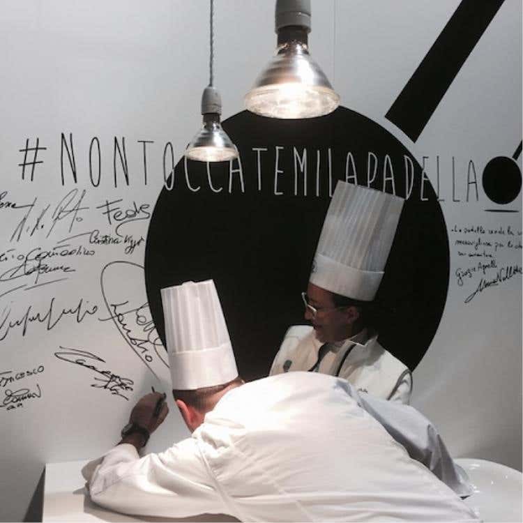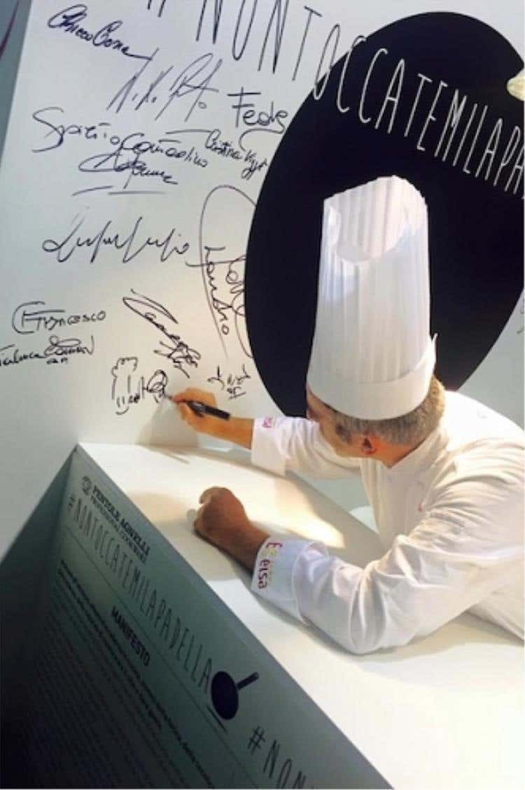 Nella foto: Enrico Derflingher, presidente di Euro-Toques Italia, mentre mette la sua firma all'iniziativa #nontoccatemilapadella di Pentole Agnelli