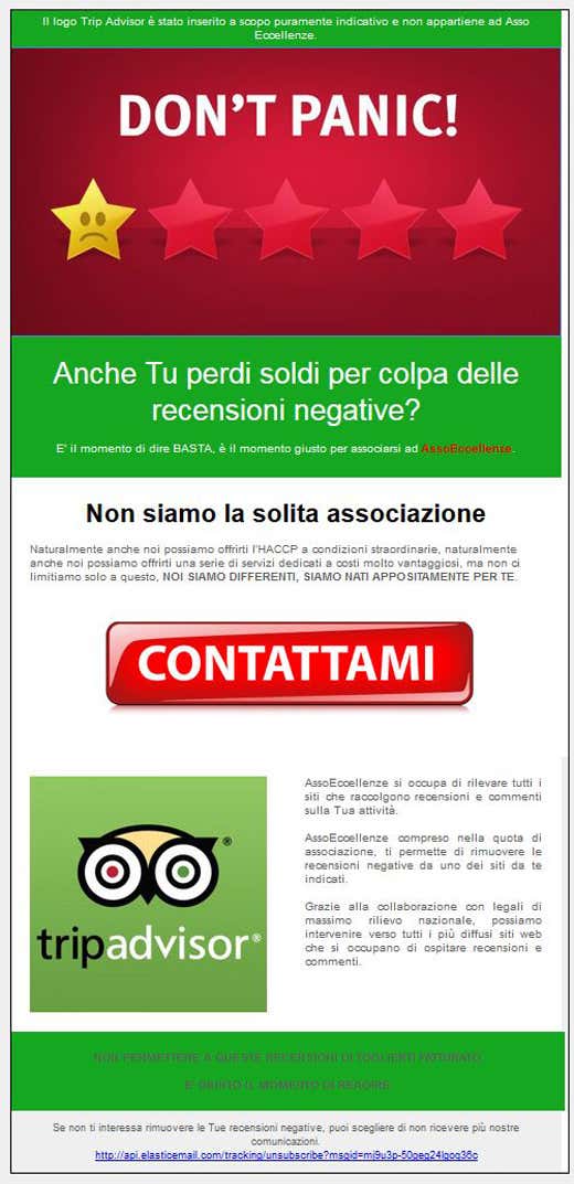 4. finte società o associazioni contattano gli esercenti proponendo una “via d’uscita”, ovvero la cancellazione delle recensioni negative (ma in teoria solo TripAdvisor può materialmente eliminare delle recensioni...).