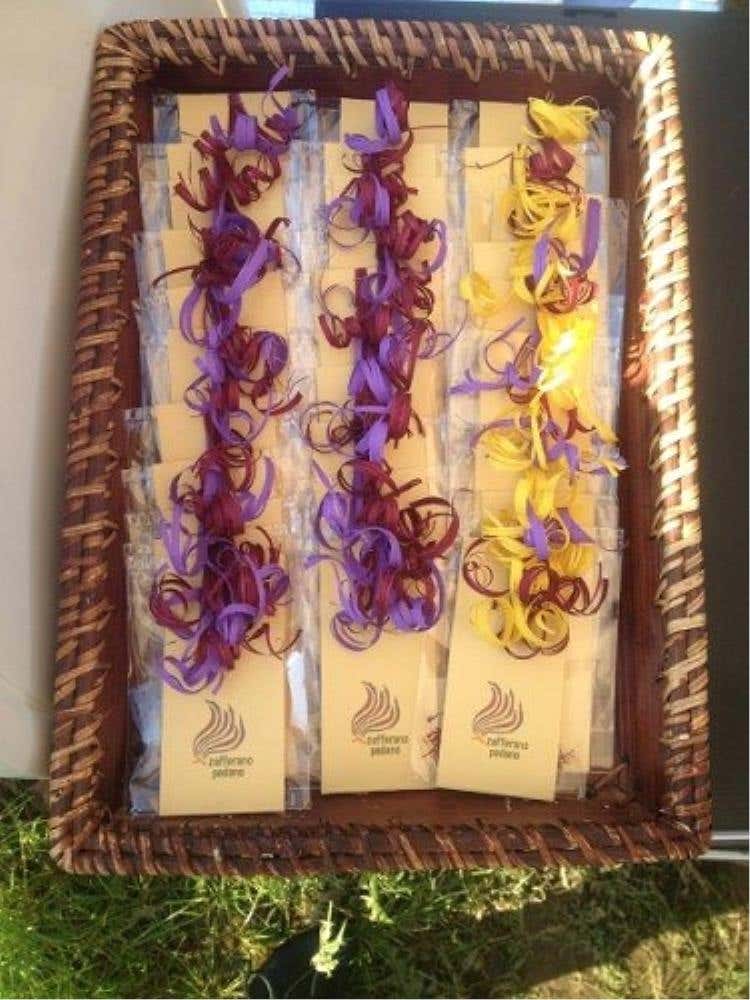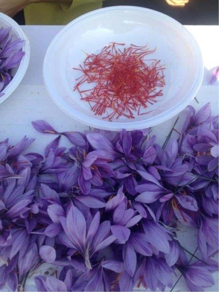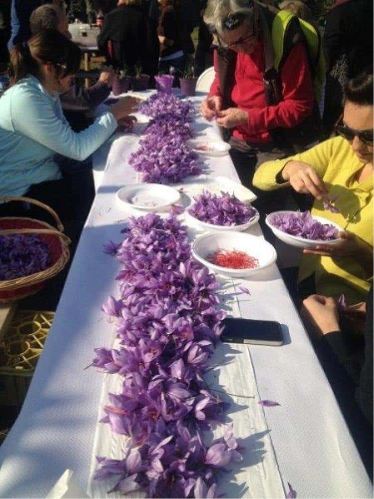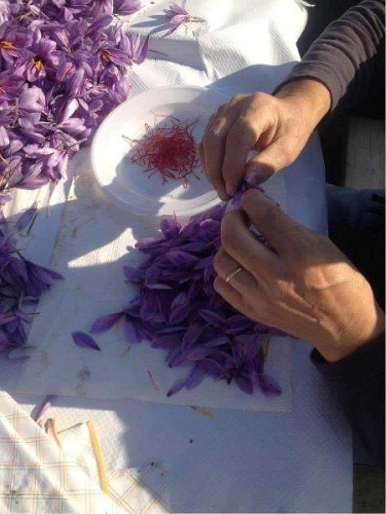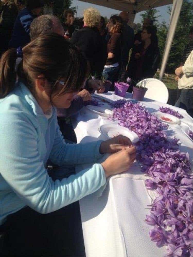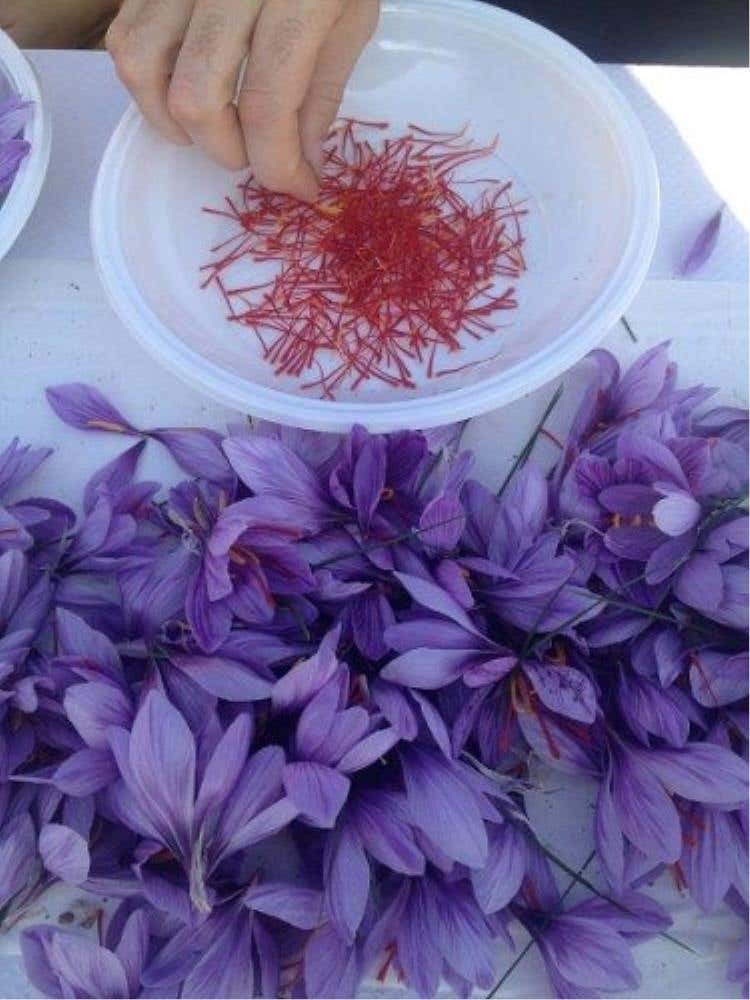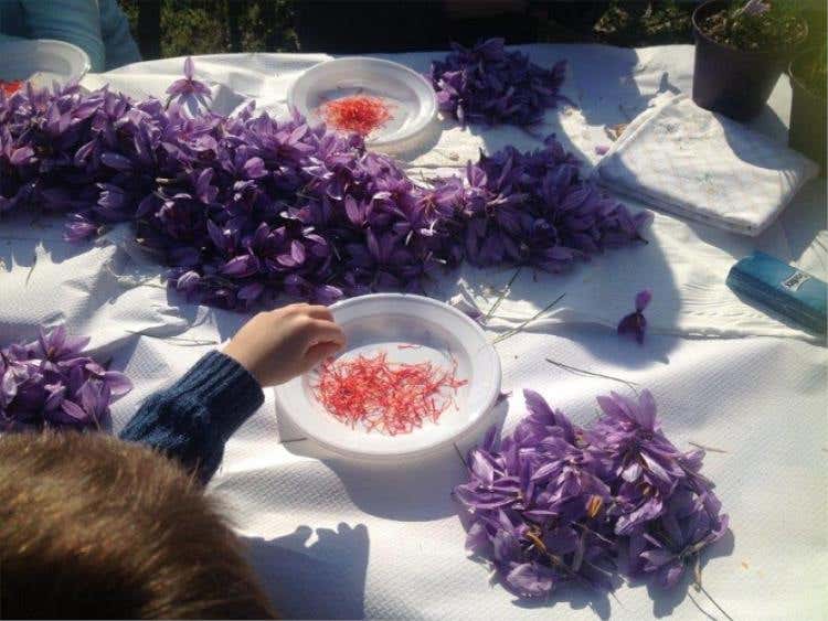 Alla fine dell’estate, infatti, i bulbi del Crocus vengono piantati e tra la fine di ottobre e i primi giorni di novembre i fiori spuntati dai bulbi vengono raccolti, uno per uno e a mano. Poi le corolle vengono mondate o sfiorate: cioè ne vengono estratti gli stimmi, ancora una volta a mano: ogni fiore produce solo tre stimmi (per raggiungere il peso di un chilo di zafferano sono necessari più di 120mila fiori!). Viene il momento, poi, dell’essicazione delle migliaia di filamenti rossi che sono stati estratti dai fiori e solo dopo quest’ultima operazione è pronto per essere usato in cucina.