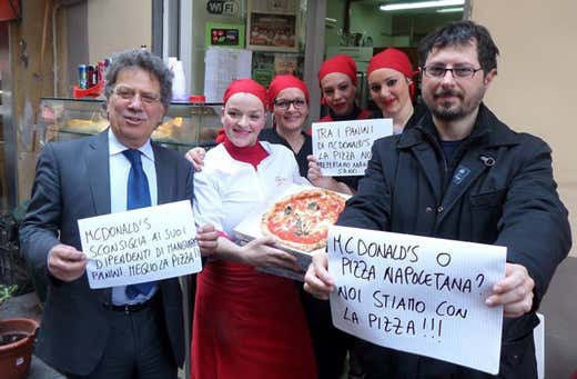 Intanto Sergio Miccù, presidente dell’associazione pizzaioli napoletani, e il politico Francesco Emilio Borrelli hanno organizzato l’esposizione del panino del fast food a fianco di una pizza in diversi locali napoletani: «Viso che McDonald’s è in vena di paragoni - spiegano - è bene farli in tutti i locali napoletani mostrando cosa ci danno a mangiare loro e cosa invece le nostre pizzerie».
