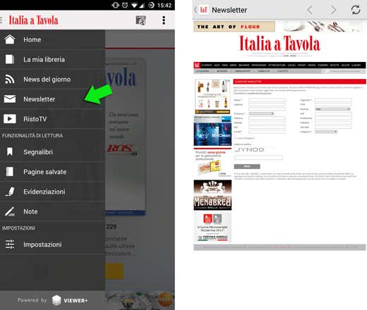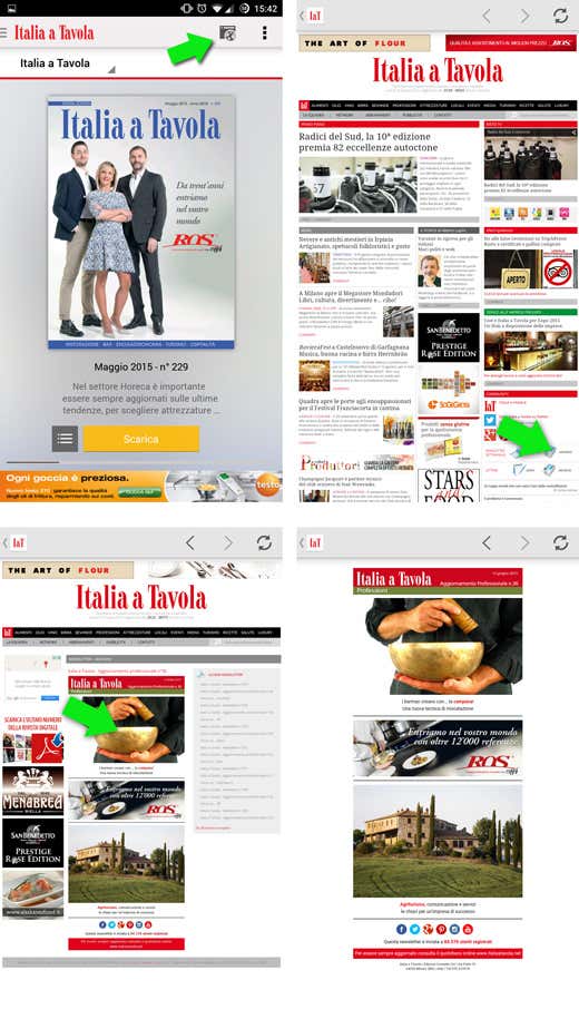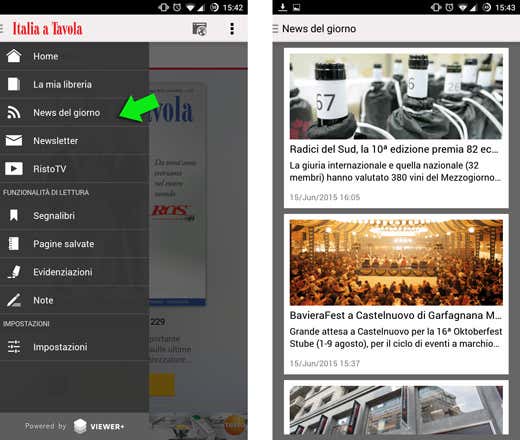 www.italiaatavola.net si può leggere sulla nuova app in due modalità: la visualizzazione classica, come su pc, a cui si accede toccando l’icona in alto a destra; e la modalità alternativa, che visualizza le news in mnaiera più sintetica a partire dalle più recenti e adatta automaticamente il formato agli schermi di tablet e dispositivi mobile.