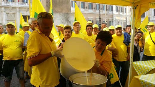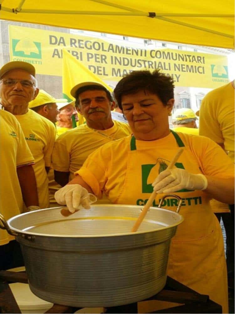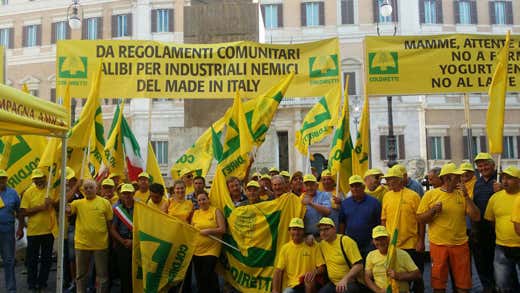 A ricordare qual è la posta in gioco, la Coldiretti ha allestito per l’occasione una maxi esposizione delle eccellenze lattiero-casearie italiane, con i prodotti più noti, e curiosi, come il Bastardo del Grappa o il formaggio Imbriago, provenienti da tutte le regioni d’Italia, ma ci sono anche sacchi interi di polvere di latte che rischiano di contaminare queste specialità.