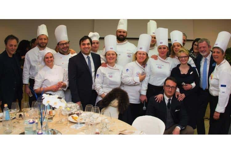 Nella foto, da sinistra: Gianluca Drago, Maria Grazia Frappi (responsabile Facebook dell'associazione Cuochi di Arezzo), Marcello Comanducci, Alberto Lupini, Rossana Del Santo (addetta alle pubbliche relazioni dell'associazione Cuochi di Arezzo) e Claudio Zeni