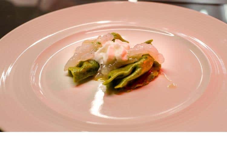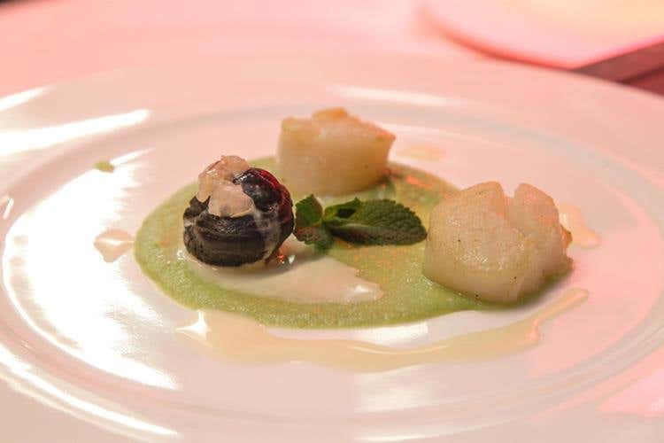Gambero al vapore, gallinella marinata al mandarino e maionese di anemoni, di Gennaro Esposito