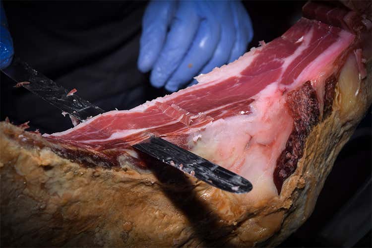 Il Jamon Iberico de Bellota, conosciuto dal grande pubblico con il nome di Pata Negra, rappresenta il top dei prosciutti a livello mondiale, con un sapore unico e incomparabile. La sue particolari caratteristiche sono legate all’allevamento in libertà nei boschi di querce dei maiali, e all’alimentazione composta da erba e ghiande, ricche di acido oleico. Questo trasforma il grasso del prosciutto in un composto molto simile all’olio d’oliva, con un elevato contenuto di colesterolo “buono” e nessuna proprietà negativa per l’alimentazione. Un grasso che si scoglie in bocca e che regala un sapore intenso e profondo, che difficilmente si riesce a dimenticare.