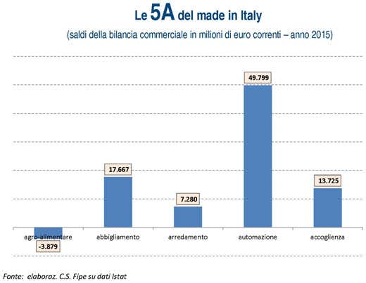 Il saldo della bilancia commerciale per il 2015 relativo alle “5 A” del Made in Italy, secondo i dati Istat, vede un dato negativo per l’agroalimentare (-3.879 milioni di euro), ma una netta crescita dell’accoglienza (13.725 milioni di euro). La migliore performance è quella del settore automazione (49.799 milioni di euro), seguita dall’abbigliamento (17.667 milioni di euro); bene anche il settore arredamento (7.280 milioni di euro).