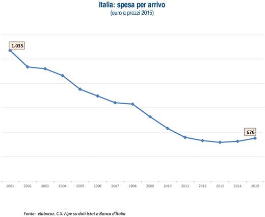 I dati Istat e Banca d’Italia evidenziano che la spesa media per ogni arrivo turistico negli ultimi 15 anni è scesa dai 1.035 euro del 2001 ai 676 euro del 2015, con un trend in ripresa negli ultimi due anni.