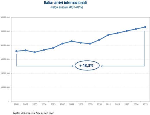 Per quanto riguarda il numero degli arrivi di turisti dall’estero, i dati Istat relativi agli ultimi 15 anni mostrano una crescita importante, del 48,3%.