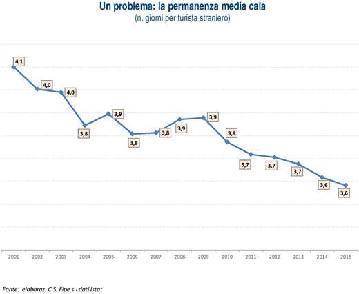 Sempre negli ultimi 15 anni, la permanenza media dei turisti stranieri è calata dalla media di 4,1 giorni del 2001 ai 3,6 giorni del 2015.