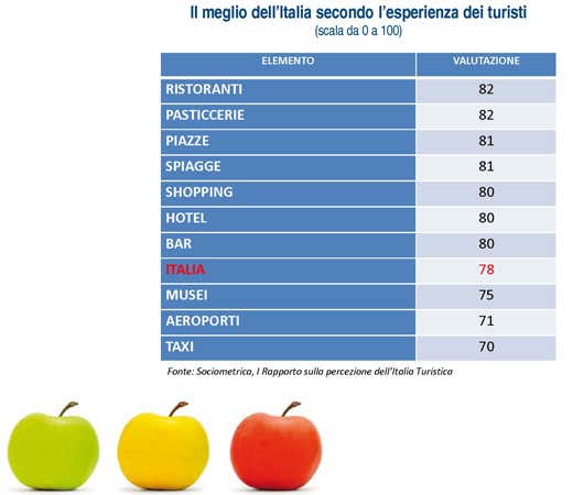 Secondo il primo Rapporto sulla percezione dell’Italia turistica di Sociometrica, il meglio dell’Italia nell’esperienza dei turisti, in una scala da 0 a 100, sono comunque ristoranti e pasticcerie, in testa con 82 punti, seguiti da piazze e spiagge (81), shopping, hotel e bar (80).