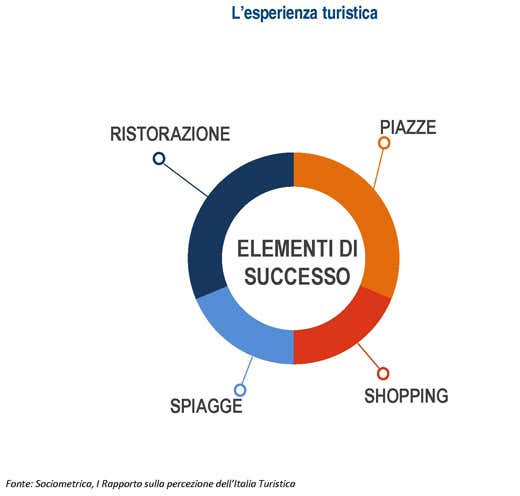 Sempre secondo il rapporto di Sociometrica, gli elementi di maggiore successo dell’esperienza turistica sono in primis ristorazione e piazze, seguite da spiagge e shopping.
