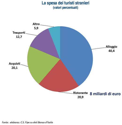 Banca d’Italia ha messo in evidenza le percentuali in cui si suddivide la spesa dei turisti stranieri: la spesa maggiore viene effettuata per l’alloggio (40,4%), segue il ristorante (20,9%), poi gli acquisti (20,1%) e i trasporti (12,7%).
