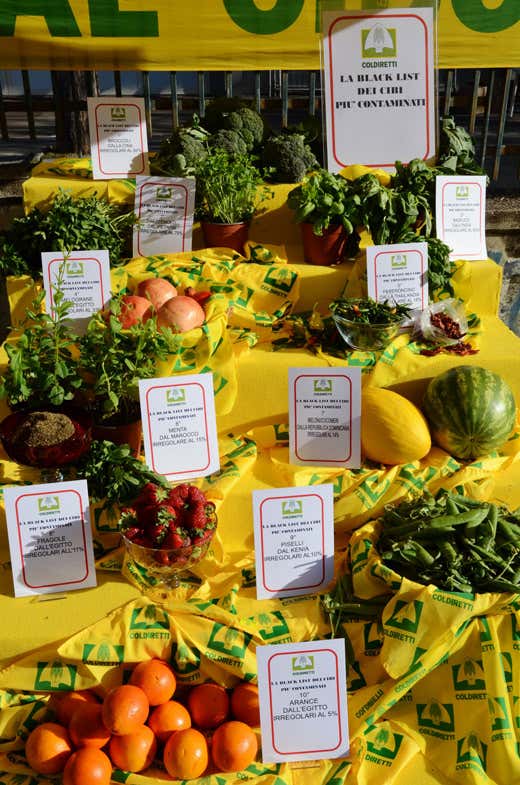 “Gli italiani lo fanno meglio” è scritto sopra all’esposizione della “Black list dei cibi più contaminati”, stilata sulla base delle analisi condotte dall’Agenzia europea per la sicurezza alimentare (Efsa) e che riguarda alimenti di uso comune arrivati in Italia da diversi continenti anche per effetto delle agevolazioni concesse dall’Unione Europea, dalla arance alle fragole, sino al peperoncino.